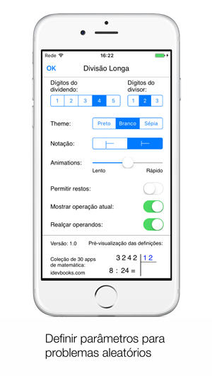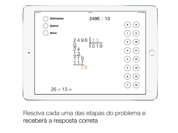 A app Divisão Longa pode ser utilizada para ensinar e estudar o método de divisão longa. O utilizador pode resolver problemas de divisão aleatórios ou personalizados, com número pequenos e grandes.