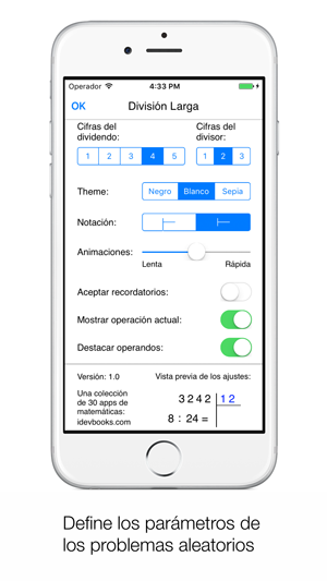 La app División larga sirve para enseñar y estudiar el método de la división larga. El usuario puede resolver problemas de divisiones personalizados y aleatorios con números pequeños y grandes.