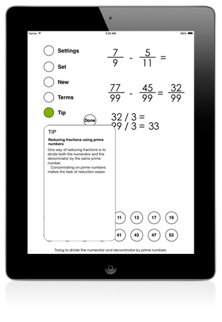 The Fraction Math app has a help system that provides over 60 context sensitive tips based on the state of the app. For example, when searching for a lowest common denominator, the help system will first tell how to search for the answer. If, after trying herself the user cannot find the answer, the help system will tell her what the lowest common denominator is. If the user finds a common denominator that is not the lowest common denominator, the help system will note this but will let the user to continue. She will just have to reduce the answer at the end.