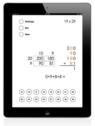 This app can be used to teach and study the grid multiplication method. The app is easy to use and it has an intuitive interactive interface with customizable colors and other settings. The user can solve random and custom multiplication problems.