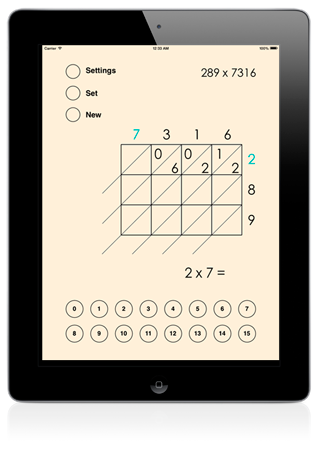 The Lattice Multiplication app allows the user to solve a lattice multiplication problem step by step and animates all the steps. In the steps the user will multiply or add. The correct answer will fly to the right place. If the user presses the wrong button the answer will appear above the keyboard but it will not move.