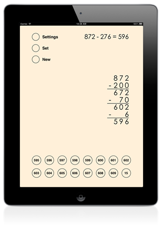 This app can be used to teach and study the left-to-right subtraction method. The app is easy to use and it has an intuitive interactive interface with customizable colors and other settings. The user can solve custom and random subtraction problems and each step is made clearer with an animation.