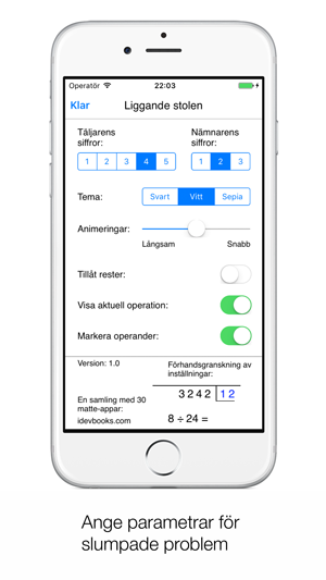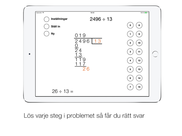 Liggande stolen-appen kan användas för att undervisa i och lära sig den långa divisionsmetoden. Användaren kan lösa anpassade och slumpade divisionsproblem med höga och låga tal.