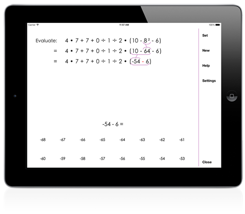 Expressions are evaluated one operation at a time just by tapping the operation. If the user taps an operation that can’t be solved next, the app tells why that was the wrong choice. There are no penalties for wrong answers.