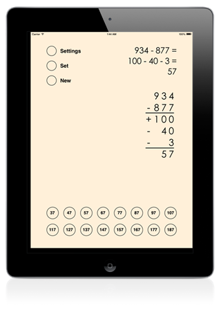 This app can be used to teach and study the partial differences subtraction method. The app is easy to use and it has an intuitive interactive interface with customizable colors and other settings. The user can solve custom and random subtraction problems. The number of digits in the numbers can be set.