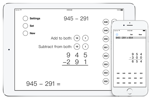 In the Same-Change Subtraction app the user can keep adding or subtracting the same amount from both numbers until the subtraction problem can be solved easily.