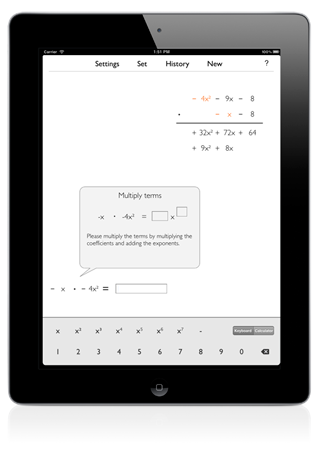 The Polynomial Multiplication app has several settings that allow you to set the difficulty to suit your needs. You can either pick answers for each step from multiple choices or you can type in the answers yourself. The former method is a great way to start using the app and then later you can start to type in your answers. Eventually you can hide the current multiplication, or addition step and solve the problems without any help.